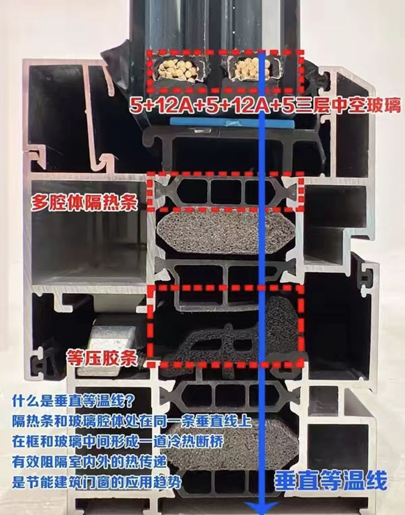 垂直等溫線指的是隔熱條和玻璃處在同一直線上,具有垂直等溫線設計的窗戶隔音、隔熱效果更好,是系統窗的標配,也是節能建筑門窗的應用趨勢。